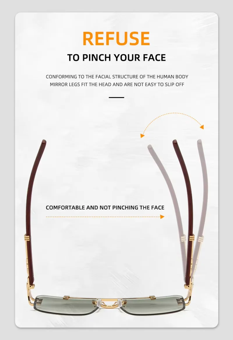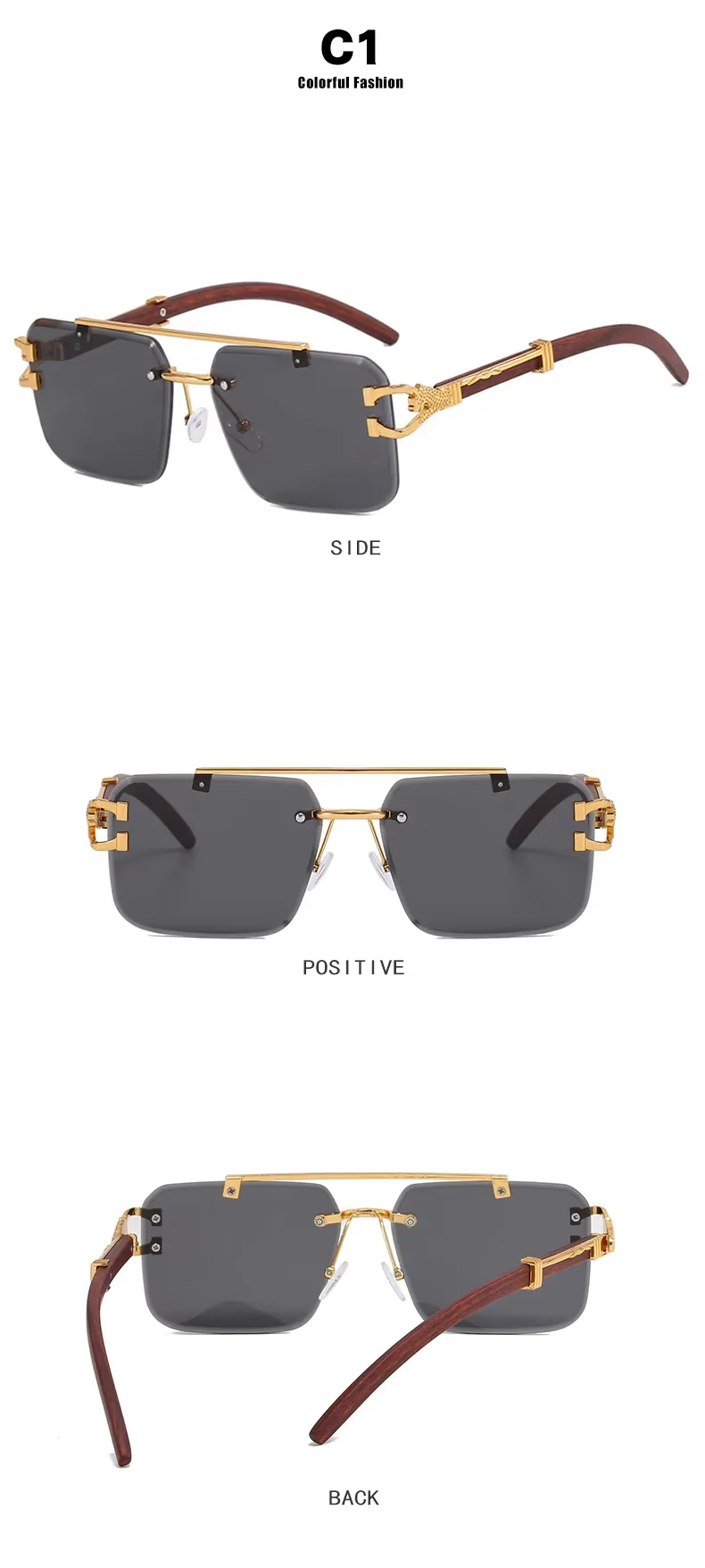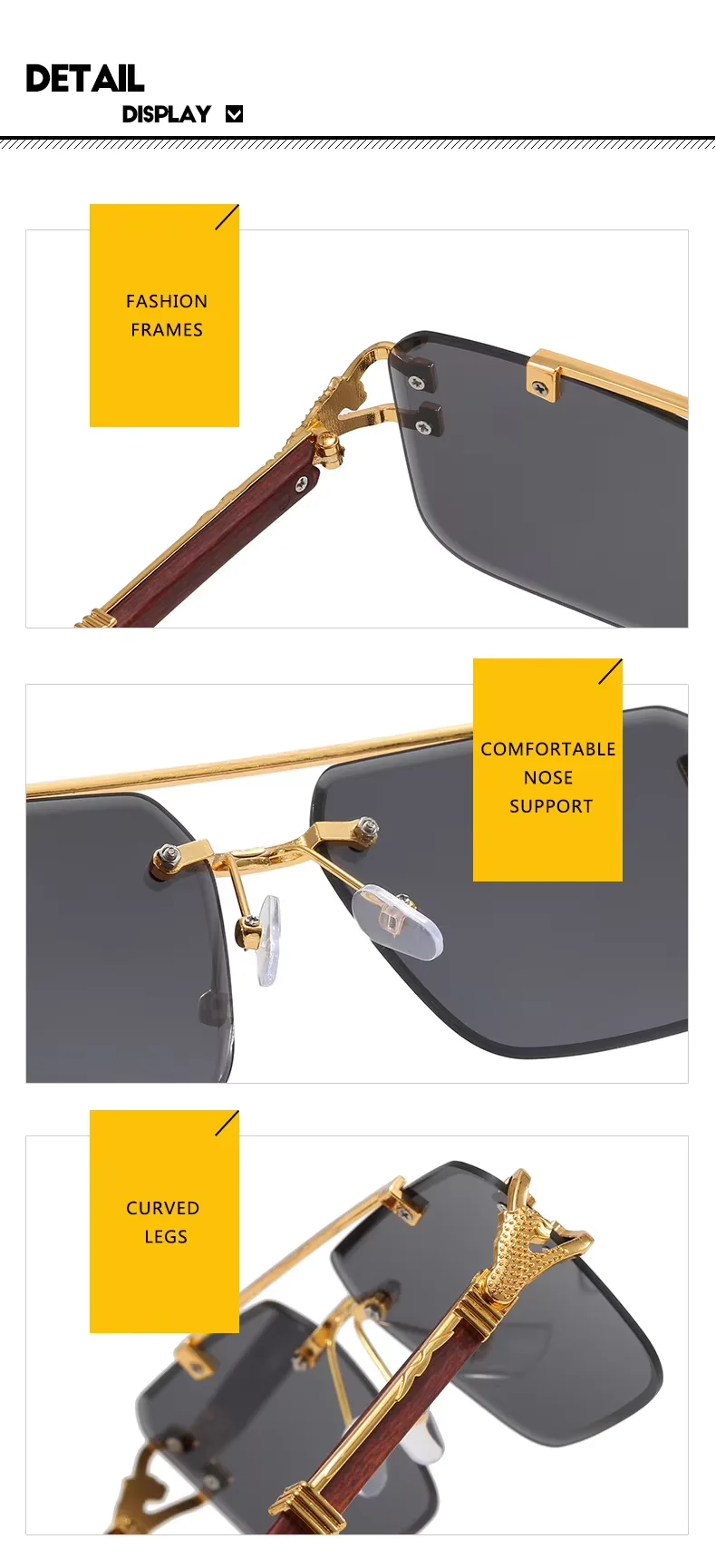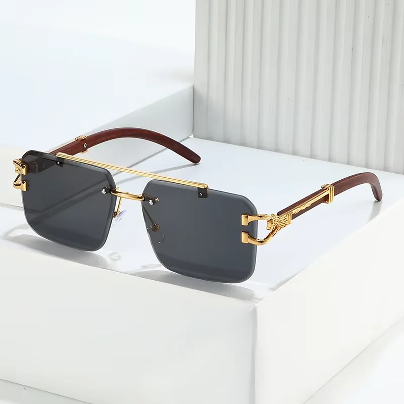 Design sans monture ultra moderne, verres noirs profonds, finitions dorées raffinées et branches effet bois — un équilibre parfait entre puissance et élégance.